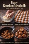 Steps showing oven baked bourbon meatballs being prepared and finished in bourbon sauce.