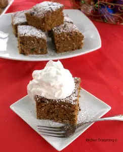 - When the cake has cooled, cut into squares and dust with powdered sugar. Serve with a dollop of fresh whipped cream.