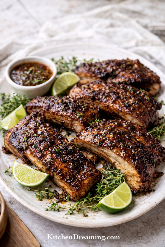 Jamaican jerk pork ribs are pork ribs seasoned with a bold blend of Caribbean spices traditionally used in Jamaican jerk cooking.