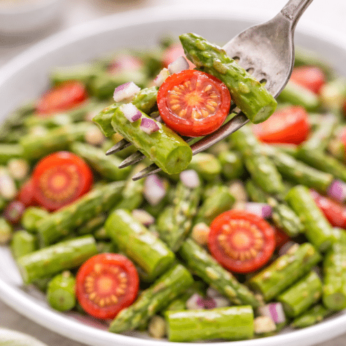 Asparagus salad has a wonderful flavor and lasts in the fridge for quite a few days. This is a great brunch salad and goes well aside eggs and omelets; it's also a great side to any weeknight meal.