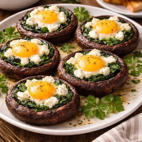 Turn the mushrooms gill side up and start building. First, place the spinach into the cap building up the sides and creating a well in the middle, if necessary, to accommodate the egg. Add some goat cheese and Carefully break one egg into the well of each of the mushroom caps.