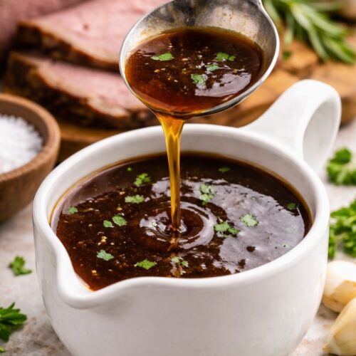 Classic Beef Au Jus Gravy is perfect for a French Dip sandwich or to accompany roasted meat like Prime Rib of Beef. It can also be thickened to make rich beef gravy.