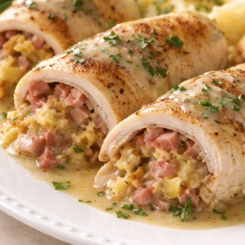 Don’t overfill: About ¼ cup stuffing per breast is ideal. Overfilling makes rolling harder and causes the filling to leak.
