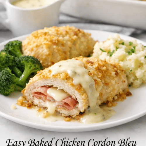 Easy {Baked} Chicken Cordon Bleu chicken breasts are layered into a baking dish, topped with ham, cheese and bread crumbs then baked to a golden brown.