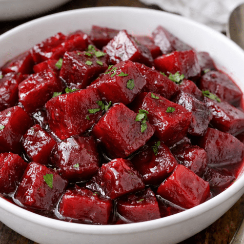 Easy Roasted Harvard Beets are a family favorite passed down from my Grandmother. In my family, we serve warm beets as a side dish at weeknight meals but also for gatherings like Thanksgiving and Christmas. These are the perfect side dish for any weeknight or holiday meal. The tangy sweet and sour sauce makes a great contrast to the meat.