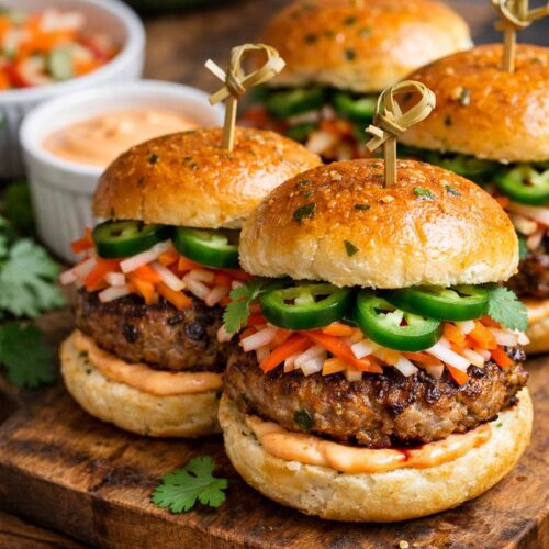Build Sliders by spreading the sriracha mayo on the buns, then top with 2 -3 jalapeno slices, add the caramelized pork patty on top. Then add the quick pickled Asian slaw, some torn cilantro, and top with the bun lid. Secure with a fancy skewer, if desired.