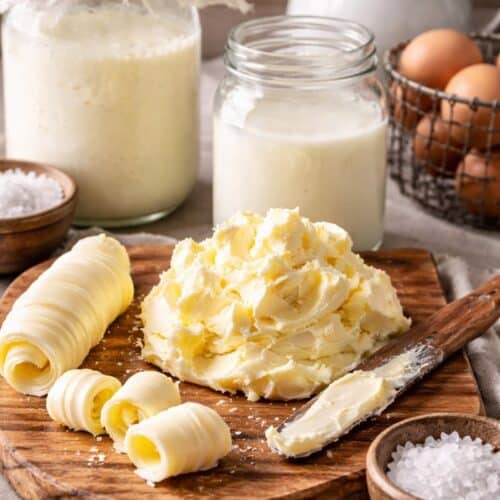 Pour the chilled cream into a stand mixer, food processor, or large jar. Mix or shake on medium speed. The cream will first become whipped, then grainy, and finally separate into butter and liquid buttermilk. This takes 5–10 minutes.