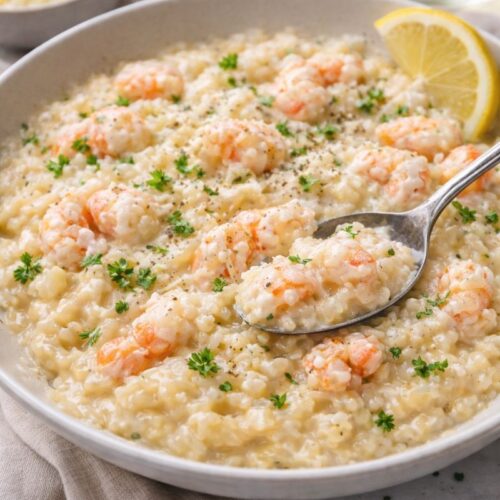 When the rice is to your desired tenderness, remove from heat and let stand 1 minute. Stir in the langostinos, butter, chives, and Parmesan. Adjust the salt and pepper, if necessary.