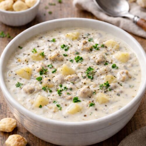 This easy New England Clam Chowder is rich and creamy and is made without bacon. Also known as white clam chowder or Rhode Island Clam Chowder, this homemade rich & creamy chowder is sure to please the "chowdah" lover on your list!