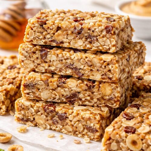 Prepare a 9x9" pan with cooking spray and line with a strip of aluminum foil. This makes it easier to remove the granola from the pan later on to cut into cubes or bars.