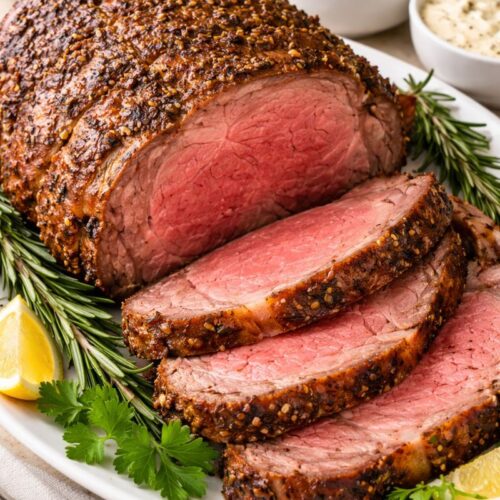 Once the meat has rested fully, snip the butcher's string and remove the bones from the roast bottom. Transfer to a platter and then slice and serve.
