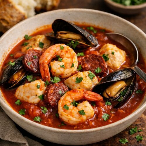 This Portuguese cioppino is fast enough for a busy weeknight but special enough for date night. You get a rich tomato-wine broth, smoky bites of chourico, and tender seafood all in one pot—plus it’s perfect with toasted bread for soaking up every last drop.