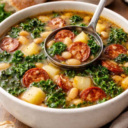 This one-pot Portuguese Sausage and Kale soup [Caldo Verde Recipe], comes together in just 30-minutes for an easy weeknight meal. It tastes even better the next day, so you might want to make a double batch!