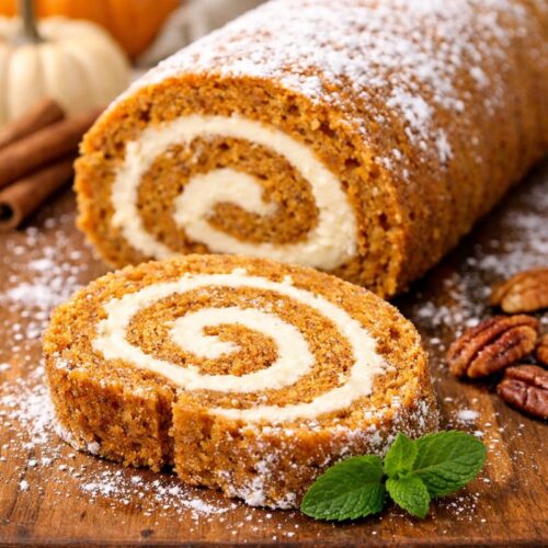 Lightly dust the top of the Pumpkin roll with powdered sugar and garnish with a sprig of mint or toasted almonds